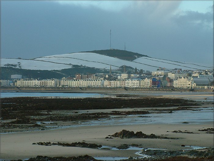 THE EARLY MORNING SUN HIGHLIGHTS THE BUILDINGS ON DOUGLAS PROMENADE
